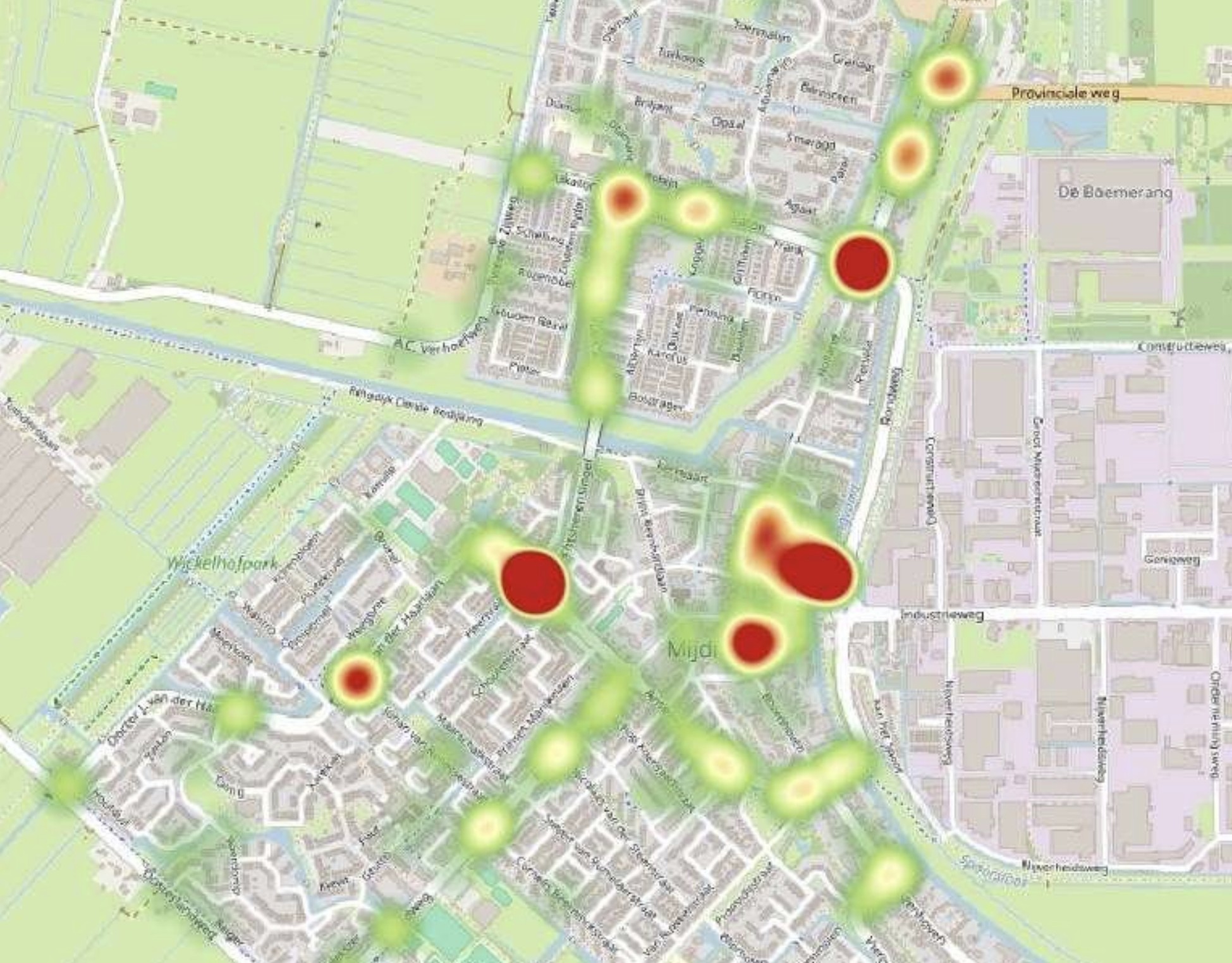 De ‘heatmap’ van meldingen in Mijdrecht: de nieuwe fietsrotonde onderaan de Kerkvaartbrug werd met afstand het meest benoemd