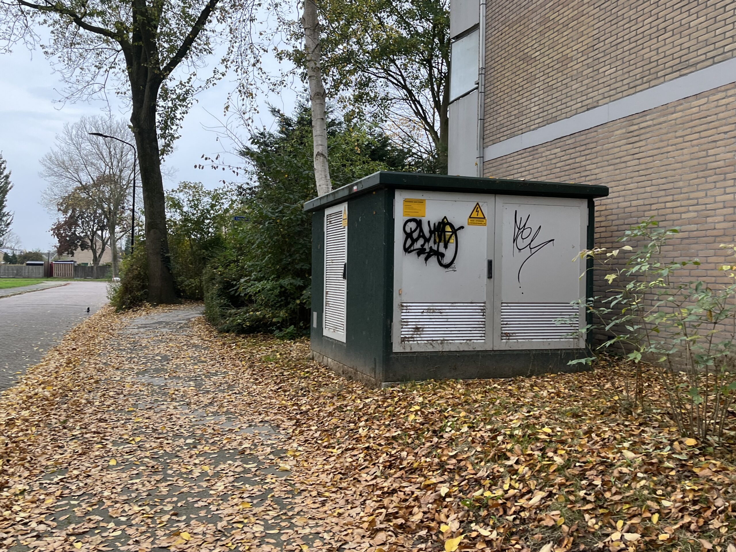 Een onbeschilderd transformatorhuisje aan de Kogger in Mijdrecht