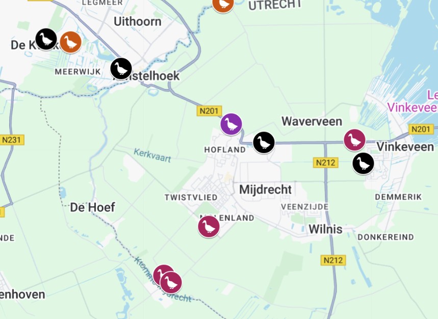 Op deze plekken zijn dieren met vogelgriepsymptomen door de dierenambulance aangetroffen