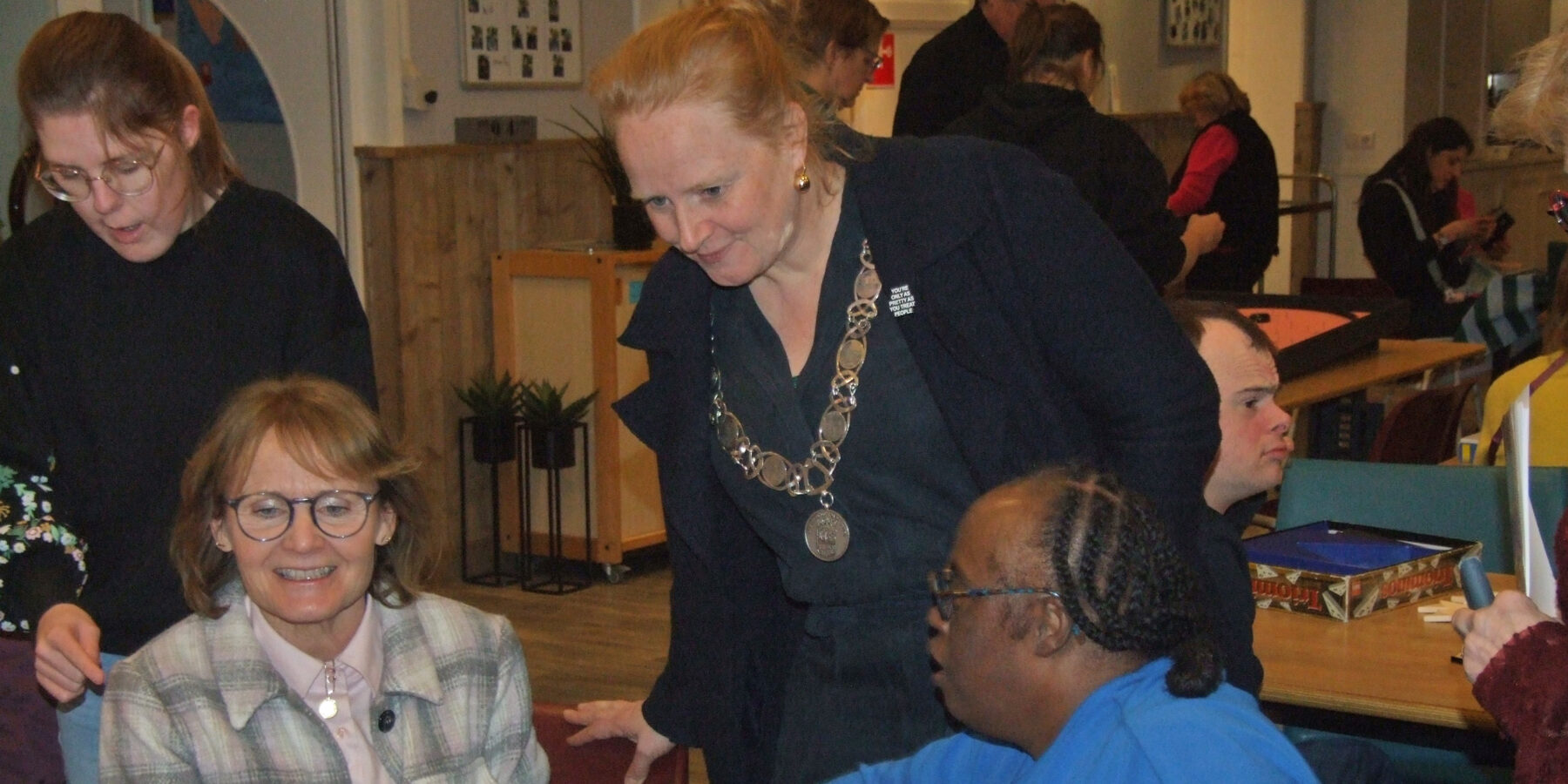 Een avond vol spelletjes, zang en foto’s: dat was het welkom dat Soos De Cirkel de burgemeester gaf. Rosan Kocken maakte deze week een ronde langs tafels met knutselwerkjes, spelcircuit en het vaste openingsritueel en sprak met bijna alle aanwezigen. De ambtsketen trok veel bekijks en heel wat bezoekers wilden op de foto.