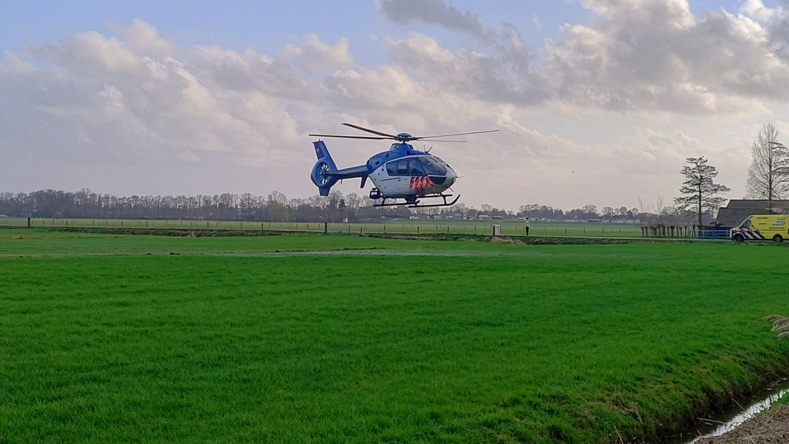 De politieheli vloog vanwege een incident bij Vinkeveen in de buurt, en landde om eerste hulp te verlenen