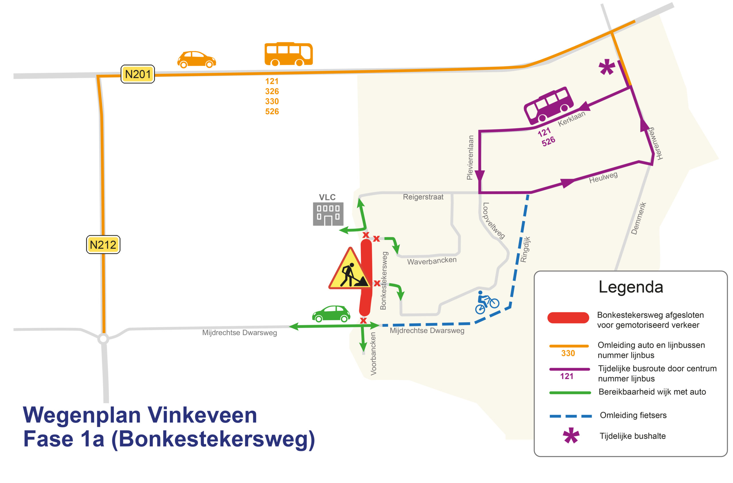 Tijdens de eerste fase van de werkzaamheden zijn de Bonkestekersweg en de Reigerstraat afwisselend afgesloten voor verkeer. Hoewel omleidingen ter plaatse worden aangegeven, blijven de woonwijken steeds vanaf één kant bereikbaar. De herinrichting heeft ook gevolgen voor het openbaar vervoer. Diverse buslijnen, waaronder de lijnen 121, 326 en 526, rijden een aangepaste route via de N212 en de N201. Hierdoor vervallen tijdelijk enkele haltes, zoals de Voorbancken en het Hoge Biezenpad, terwijl er op de Herenweg een tijdelijke halte wordt geplaatst voor overstappers.